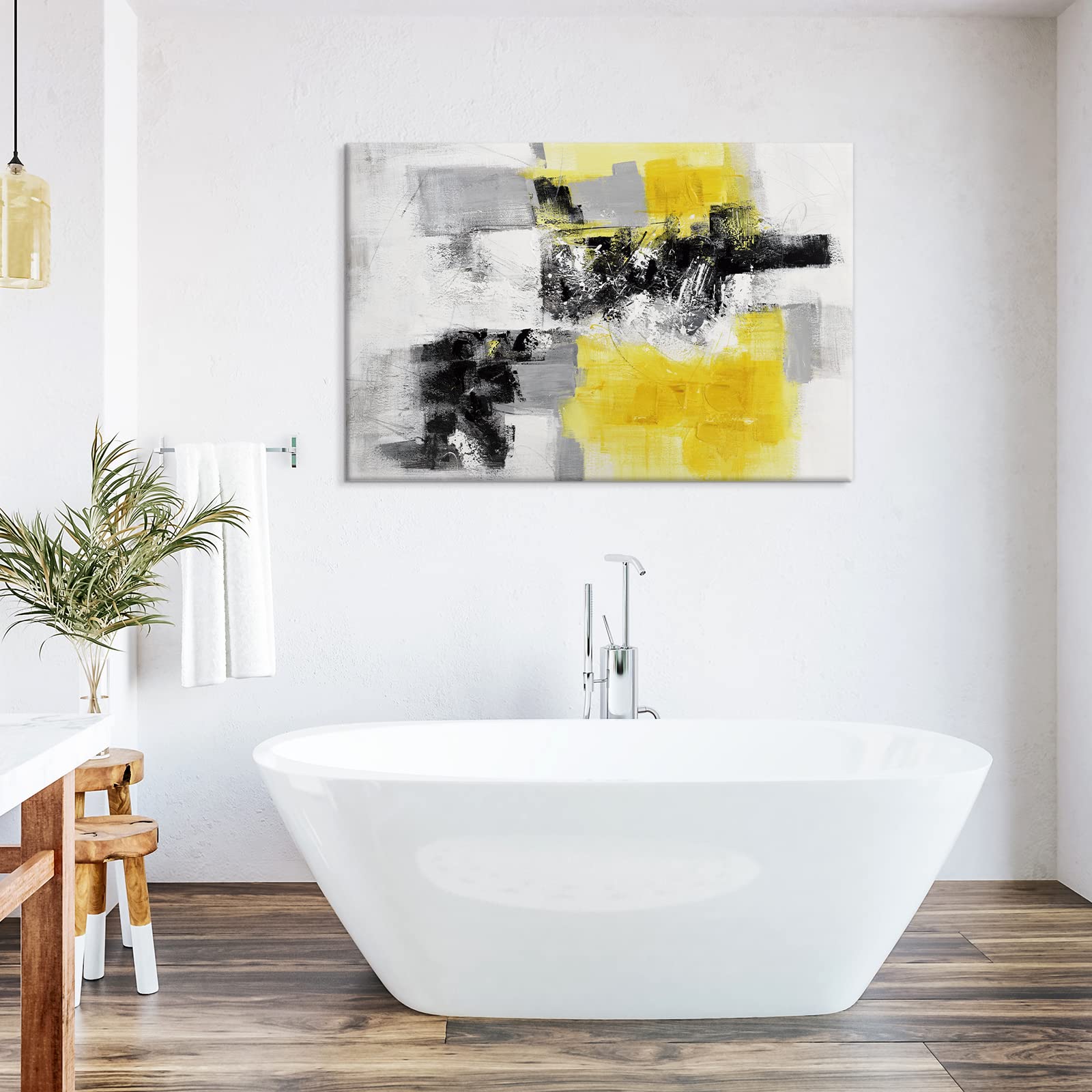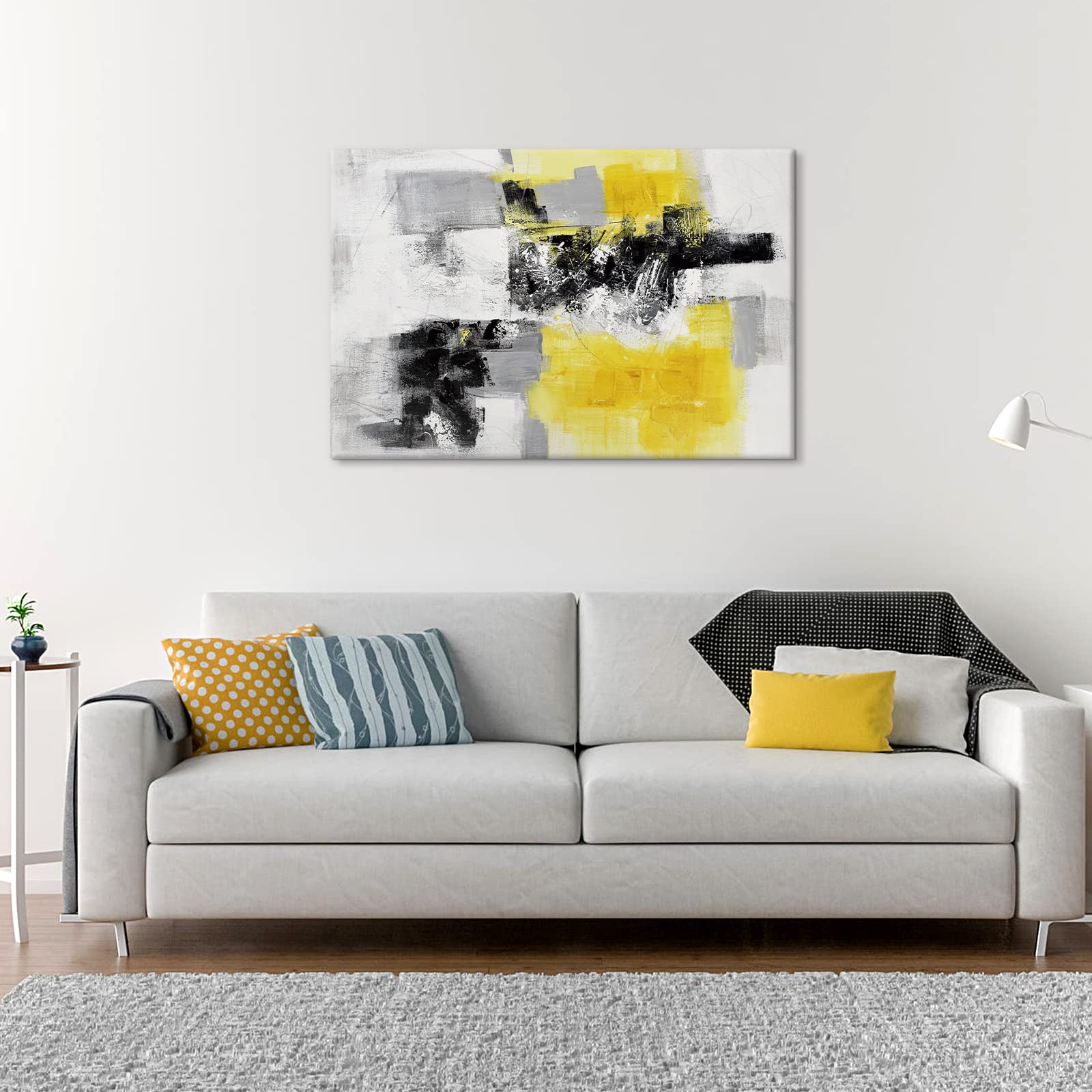 Yellow, Black and White Abstract Canvas Wall Art, Large Framed Painting for Bedroom, Living Room, Kitchen or Office 48"x32"