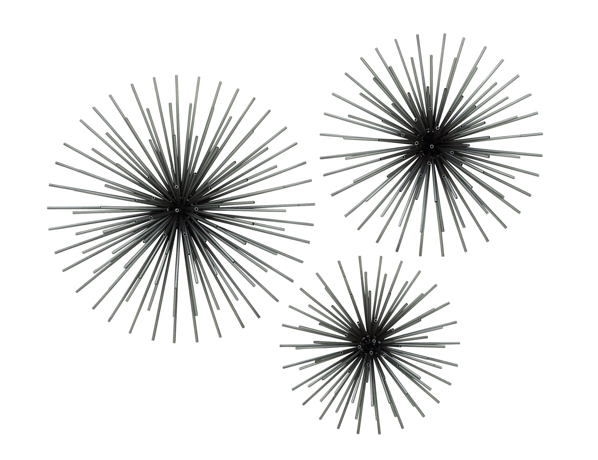 Details: A 3D wall art home decor set highlighting metal tubes that will make a statement in any entryway, living room, bedroom, or dining area. This item ships in 1 carton. 3D wall decor with soft black metal spikes creating orb shapes. Can be hung vertically using the d-rings; nails and screws not included. Suitable for indoor use only. This item ships fully assembled in one piece. This black colored iron wall sculptures comes as a set of 3. Contemporary style.