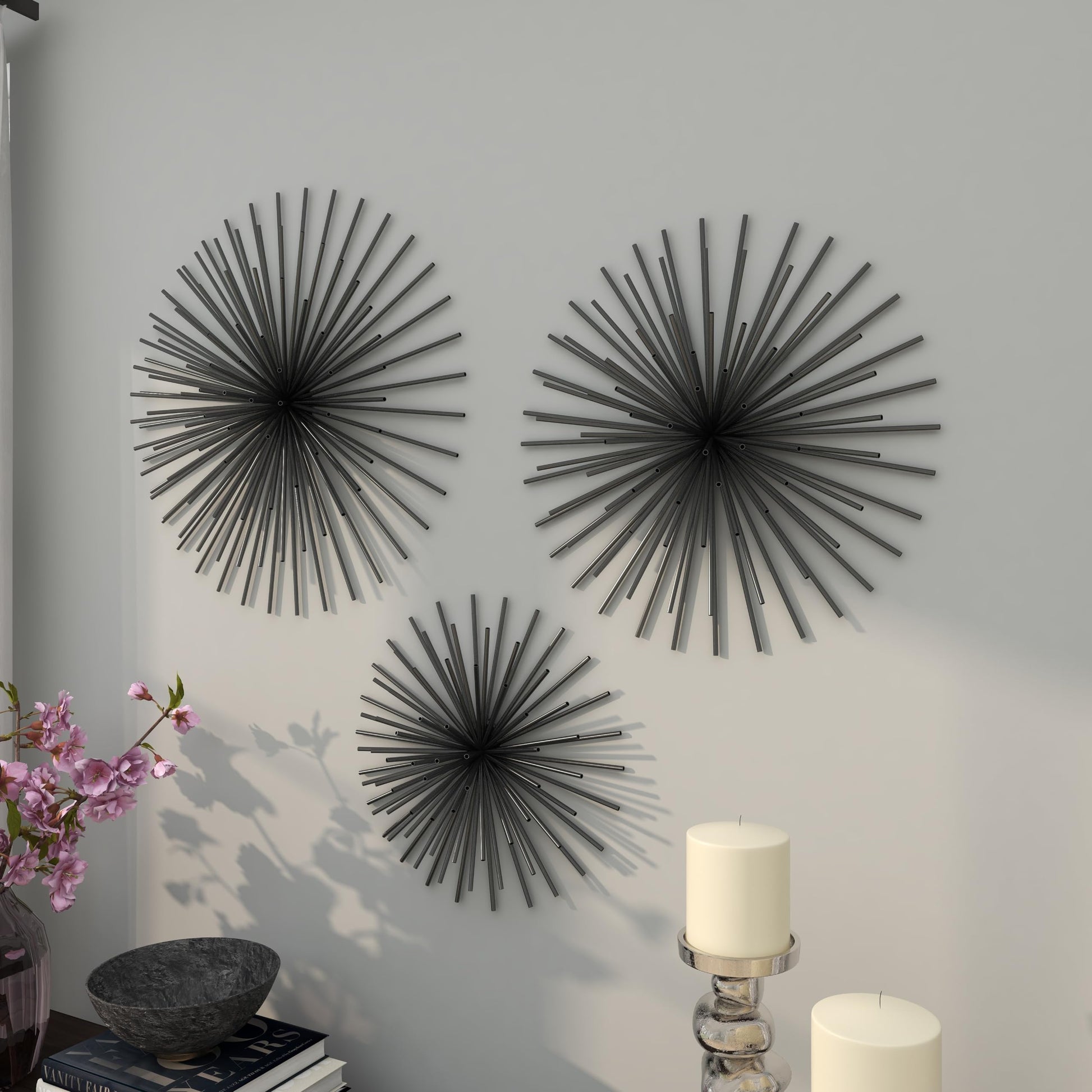 - STARBURST ROUND ROOM WALL DECOR: 3D wall art starburst designs with metallic black finishes, each wall sculpture creates a dynamic orb shape jutting out from the wall in 3 different sizes