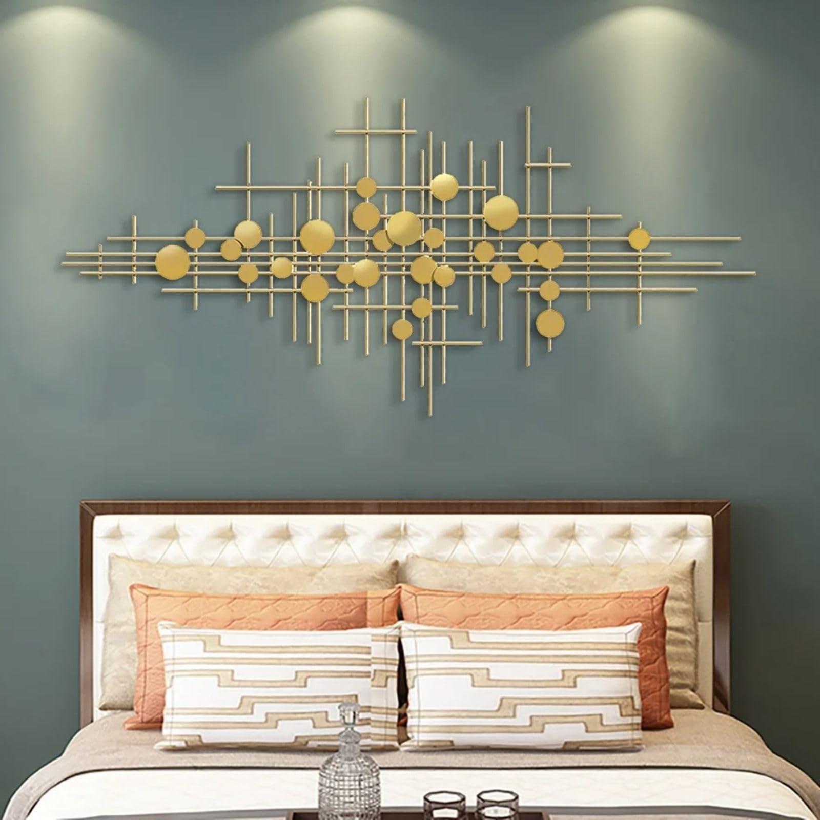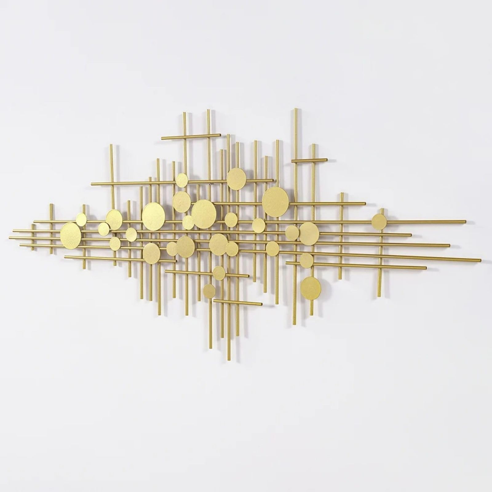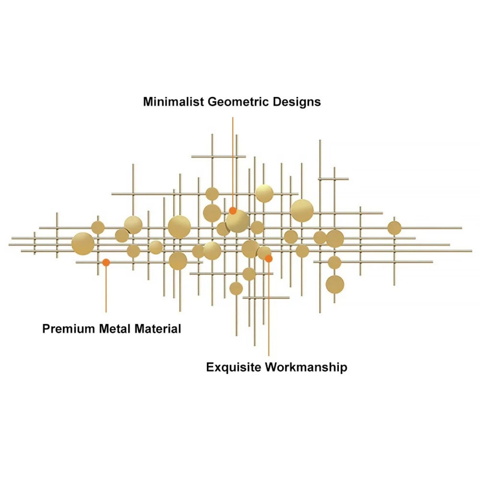 Details: Description: Style up your wall space with this gold finish metal wall decor. This large wall decor features metal lines and metal golden circles to add some geometric fun and look. This abstract design creates quite a statement piece in any modern or contemporary-styled home. It works wonders in any room, adding instant personality. Elevate your interior with this 58.3" modern gold metal wall art — an oversized geometric sculpture that pairs clean metal bars with glossy gold circles for a statement-making centerpiece. Built from solid metal and finished for lasting luster, it’s designed to bring sleek, contemporary style to living rooms, bedrooms, and entryways. Easy to style, easy to hang — transform blank walls into gallery-worthy spaces. - Sturdy & solid metal material - Modern style - Abstract bar & dots modern decor - Fit for various occasions - Come in one piece