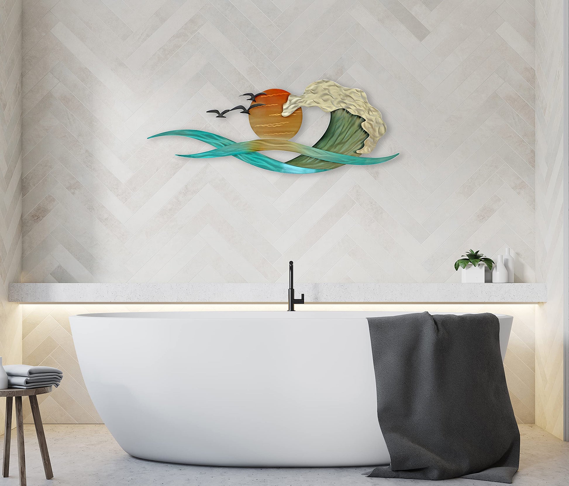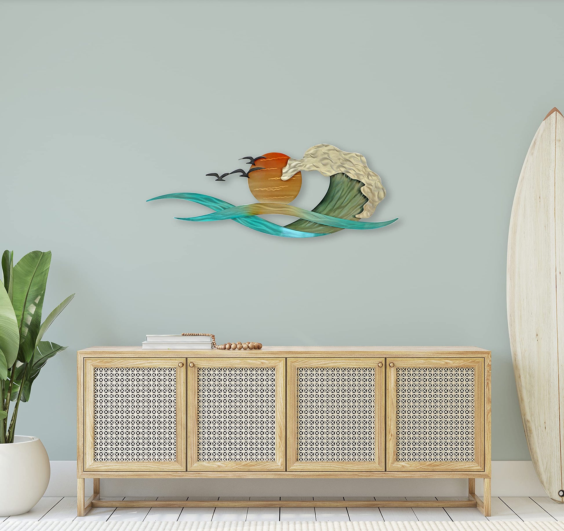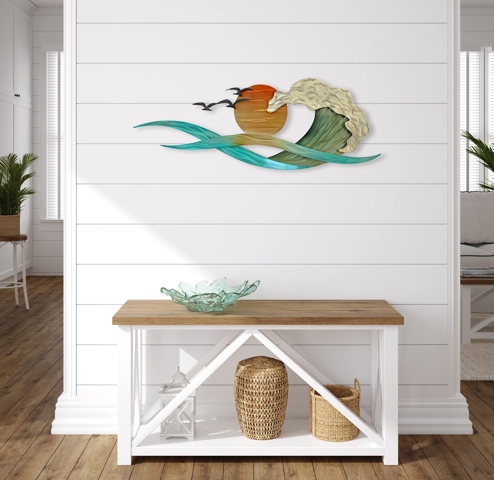 Details: Looking to refresh your coastal home décor? Our Waves and Blazing Sun metal wall sculpture is designed by Florida artist Joanne Ferrara and handmade from stainless steel, making this wall décor a unique high-quality addition to your existing home décor. Our dimensional metal wall art hangs easily from metal loops mounted to the back, and is safe for use indoors or outdoors under a covered area. Hanging hardware not included. If you are looking for coastal decorating ideas, this wall art is recommended for indoor or outdoor placement, and would make a beautiful display in your kitchen, living room, bedroom, bathroom, patio, porch, or lanai with contemporary, modern, beach house, or coastal/tropical themes.